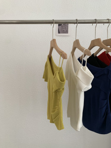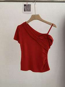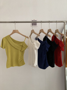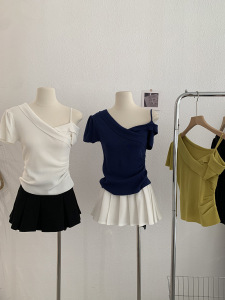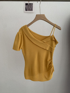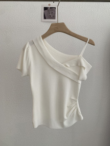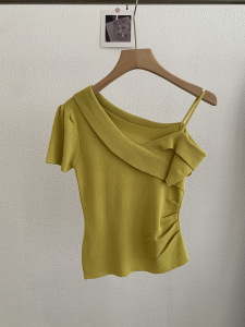 Omalai 斜め肩 V ネックスリムフィット不規則なフリル無地半袖セータートップ卸売 3800