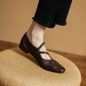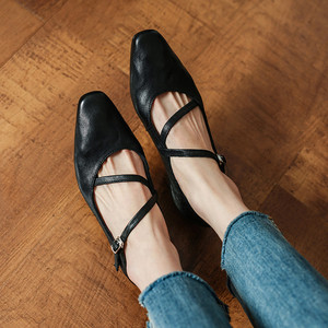 馬革浅口シングルシューズレディースフラットヒール秋新作内外フルレザーラウンドトゥベルトバックル浅口シングルシューズレディースシューズ