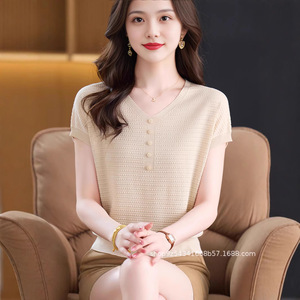 1 夏のアイスシルクニット半袖 Tシャツ女性のための 2025 新しいファッション多用途 V ネック薄型快適な Tシャツトップス女性のための
