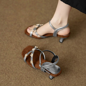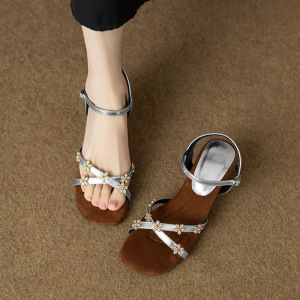 既製品のフレンチラインストーンフラワーワンラインスクエアトゥレザーサンダル、フェミニンでスカートとハイヒールローマンシューズに合わせやすい