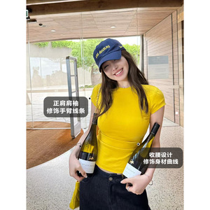 ミントグリーンショルダー半袖Tシャツ女性用2025新しいラウンドネックスリム夏ドーパミン着用ホットガールBMトップ