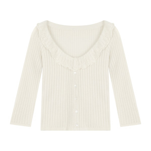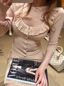 スイート属性梳毛レースカラーニットトップ、中空フリル、エレガントな七分袖シャツ、ウエストカーディガン