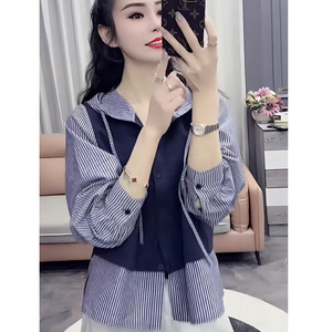 2025 春の新レトロストライプステッチルーズ痩身フード付き偽ツーピースインターネットセレブ人気の女性のための長袖シャツ