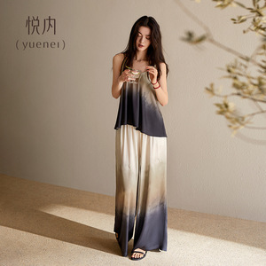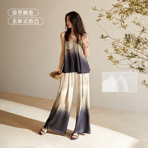 Yuenai パジャマ胸パッド付き女性の夏サマーキャミソールワイドレッグパンツアイスシルクホーム服グラデーションタイダイ