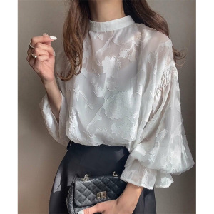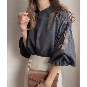日本楽天の新しい夏の花柄ジャカードランタンスリーブ透明シャツ