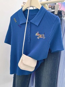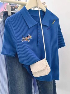 ブルーレインボーポニー右肩半袖Tシャツレディース夏新作おしゃれ年齢軽減ファッションポロカラーラージサイズトップ