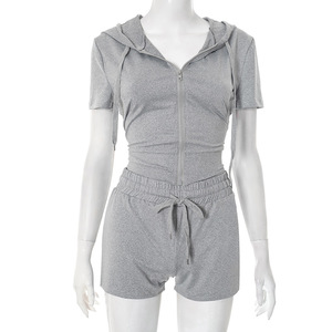 J25ST114 ヨーロッパとアメリカのクロスボーダー婦人服春夏フード付きスポーツジッパー弾性巾着ハイウエストルーズスリーポイントスーツ