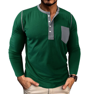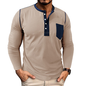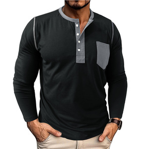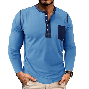 ヨーロッパとアメリカのメンズラウンドネック長袖コントラストカラーポケットヘンリーシャツクロスボーダー外国貿易アメカジTシャツボトムスメンズトップス