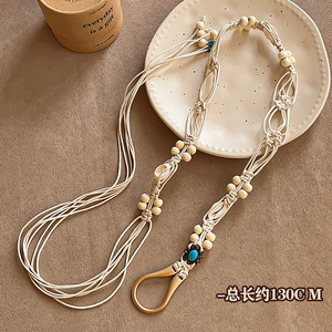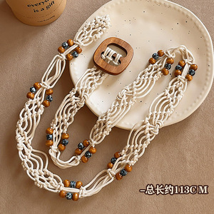 ベージュの木製スクエアリング編み込みウエストロープ-113.5CM