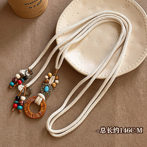 ブラウンウッドビーズフラワーオフホワイトウエストロープ-135CM