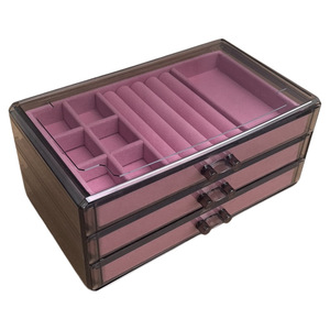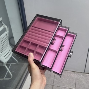 透明グレー 3 ドロー ジュエリー ボックス (ピンク/18+6 グリッド + 空のプレート)