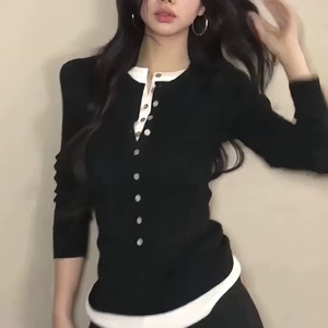 秋冬の女性用フェイクツーピースボトリングシャツ、スリムフィットトップ、デザイン長袖Tシャツ、ネットセレブのインナーファッション
