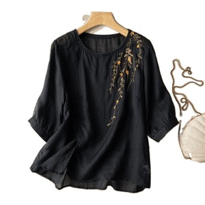 綿とリネンの半袖シャツ女性の夏薄い女性の中国風ラミートップ刺繍リネンシャツストレートヘア直販