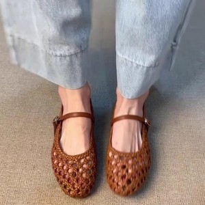フレンチスタイルの中空織りフラットメッシュサンダル、女性用夏織りワンラインバックルストラップ浅い豚かご靴