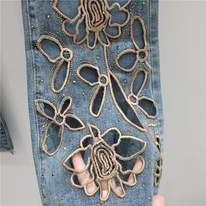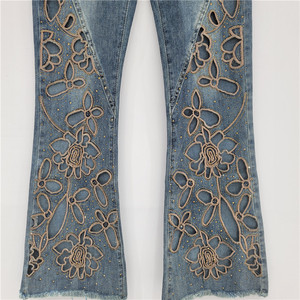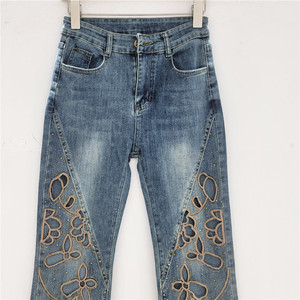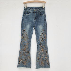夏の新ファッションヘビーデューティホットダイヤモンド中空刺繍ジーンズフェミニンスリム多用途9点マイクロフレアパンツ