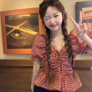 フレンチスタイルの女性用パフスリーブシャツ2025新しい夏のVネックチェック柄シャツは肉をカバーし、痩身半袖トップス