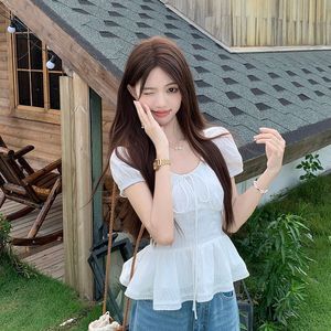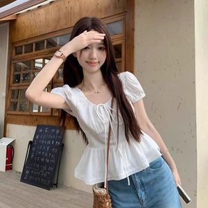 フレンチパフスリーブシャツ女性のための夏の2025新しい韓国スタイルラウンドネックショートウエスト気質純粋な欲望半袖トップ