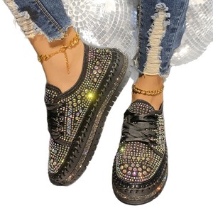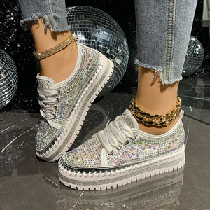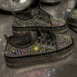 春夏季手工缝制休闲单鞋女欧美新款镶钻厚底时尚亮片松糕系带女鞋