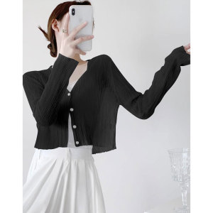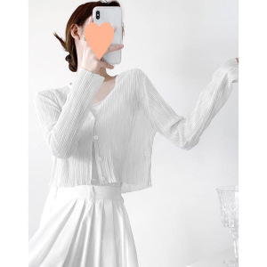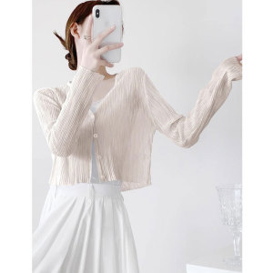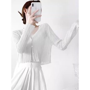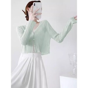 女性用日焼け止めカーディガン、サスペンダースカート付き薄手、夏用ショートトップ、竹麻アイスシルクアウター、長袖Vネックブラウス