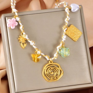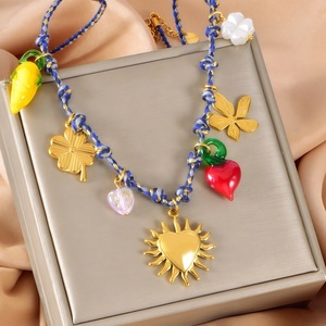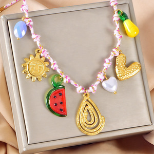 クロスボーダー新しいファッション織りカラフルなロープマルチ要素ペンダントネックレス愛巻貝グリッドペンダントチタン鋼鎖骨チェーン