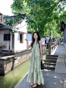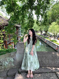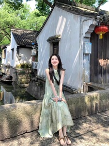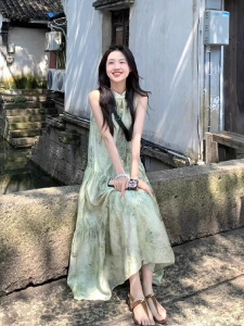 新しい中国風のバックルグリーンホルターネックドレス女性のための夏 2025 新しいノースリーブルーズティーブレイクロングスカート