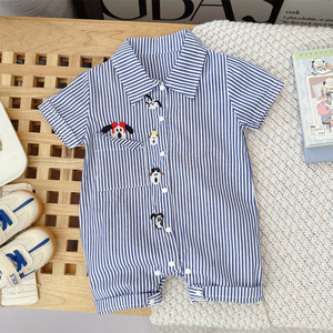 0-2歳のトレンディな幼児ジャンプスーツ、綿通気性のある夏用ベビーラペルブルーストライプロンパース、男女兼用