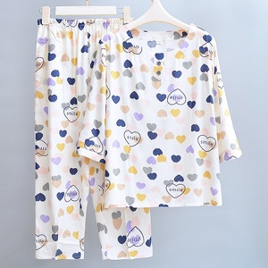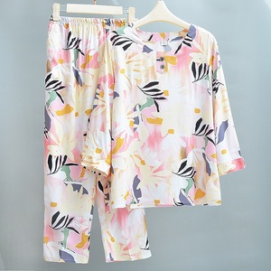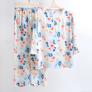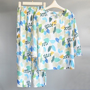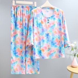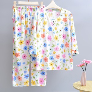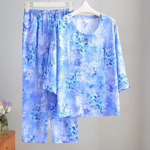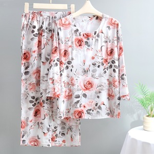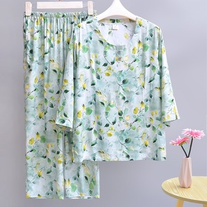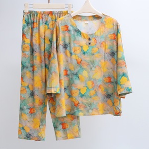 女性用綿シルクパジャマ、夏用薄手、中高年ママ、ゆったり綿シルクホーム服、七分袖お出かけスーツ