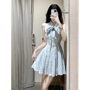 女性のための多用途ノースリーブホルターネックチェック柄ドレス夏 2025 新しいスタイル小柄フレンチスイートプリーツ temu