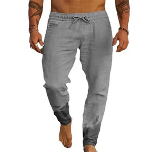 ヨーロッパとアメリカの独立したステーションクロスボーダー新しいメンズソリッドカラー巾着コットンとリネンルーズカジュアルビーチカジュアルパンツ