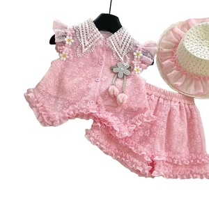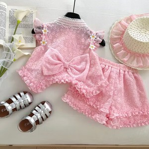 夏の女の子のスーツ新しい女の赤ちゃん 2025 レースフラワーフライスリーブシャツトップレースショーツ 2 点セット