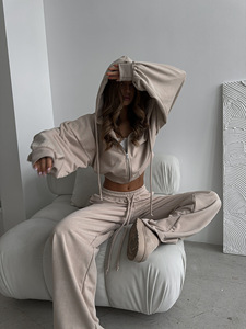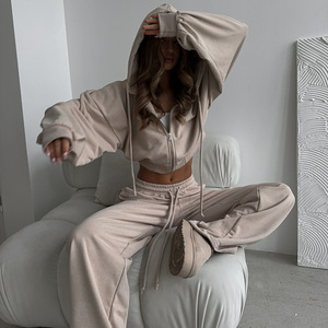ヨーロッパとアメリカの女性のカジュアルスーツ無地長袖ジッパーカーディガン巾着フード付きスウェットシャツスポーツ弾性パンツ 2 点セット