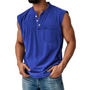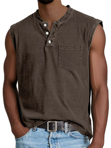 2025 ヨーロッパとアメリカのクロスボーダーメンズノースリーブワイドショルダーベストアマゾンメンズヘンリーカラーボタンフィットネススポーツトップ