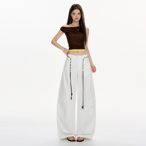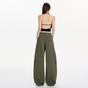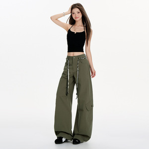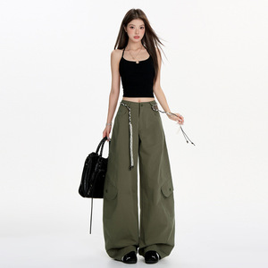 ウエストロープなしアーミーグリーンアメリカンストリートルーズワイドレッグパンツ女性の夏の怠惰なスタイルオーバーオールハイウエストシミターパンツ