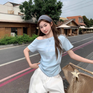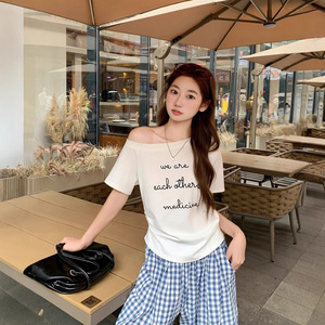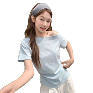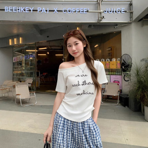 不規則な斜め襟レタープリント半袖Tシャツ女性用2025新作プリーツウエスト痩身オフショルダーショートトップ