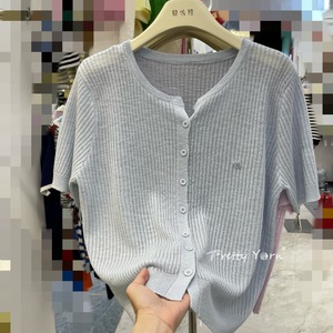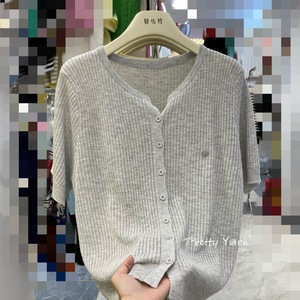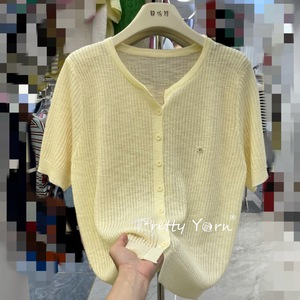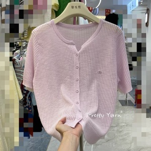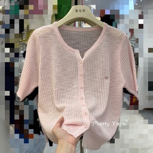 ハーフシュガーマカロン雰囲気スモールラベルハーフオープンスモールVラウンドネックアイスリネン半袖カーディガンレディース夏シンプルで万能なニット