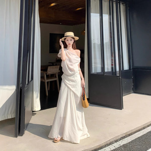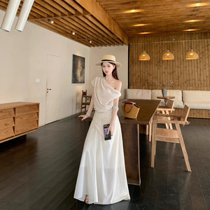 不規則なデザインの神秘的なオールドマネースタイルの女性用ツーピースサマートップ+スカート白スーツスカートのリアルショット