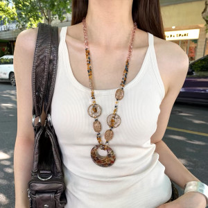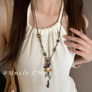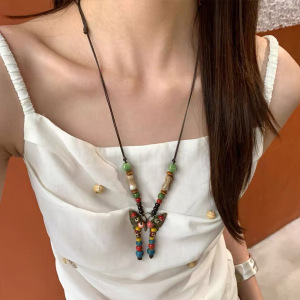 レトロなデザインの女性用ロングペンダントネックレス、ボヘミアンエスニックスタイルのビーズ鎖骨チェーン、積み重ねセーターチェーン