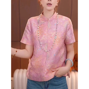 新しい中国風ピンク宋錦ジャカード半袖シャツ女性のための 2025 夏スタンドカラーボタンプリントショルダートップ