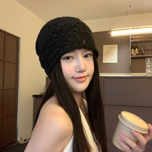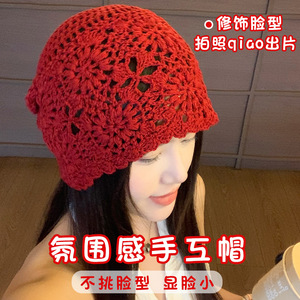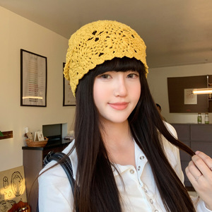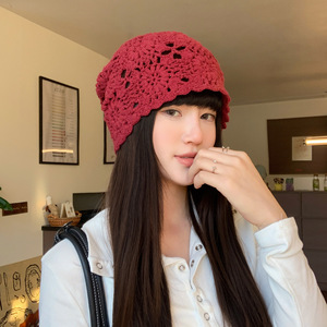 春と秋の手織りつば帽子女性の薄い中空ウール帽子レトロ文学ニット帽子パイル帽子