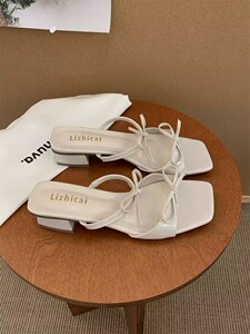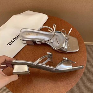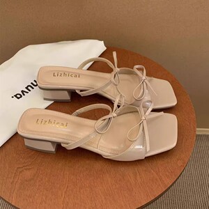 ファッショナブルで美しい〜太いヒールフレンチリボンスクエアトゥオープントゥサンダル女性のアウターシューズ2025夏新作