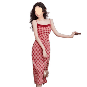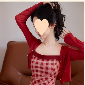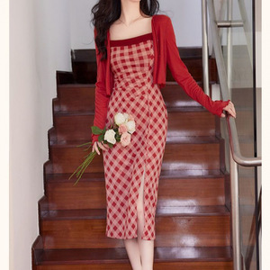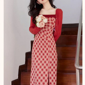 赤いチェック柄ドレス2025年初春新作甘辛スタイルレディ風サスペンダーカーディガンツーピーススーツ