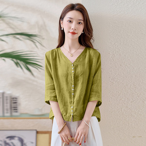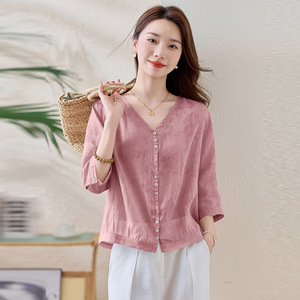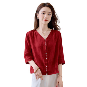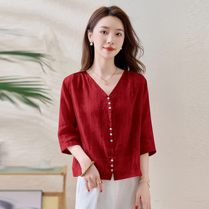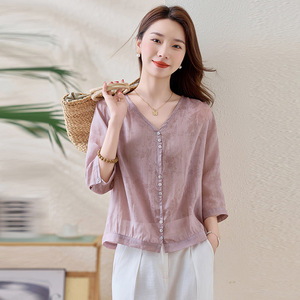 女性のためのハイエンドラミー五分袖シャツ 2025 夏の新しい V ネックルーズでスタイリッシュな年齢を軽減するプリントシャツトップ