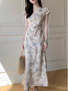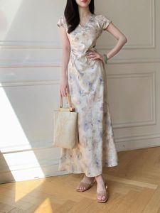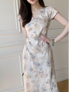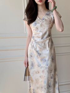 2025 Xia Xin ライト高級中国風油絵 V ネック A ライン新中国風ジャカードサテン改良されたチャイナドレスウエストドレス