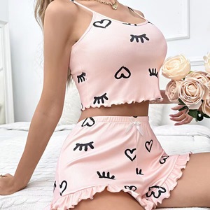2025 新しいセクシーなサスペンダープリント耳レースホームウェアサスペンダーパジャマ 2 点セット 7018