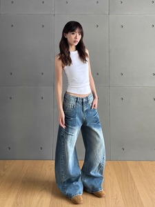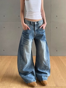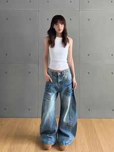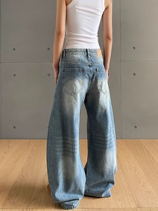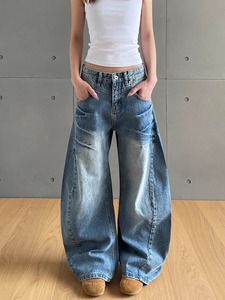 裂纹水洗牛仔裤男直筒宽松弯刀阔腿美式高街裤子潮流百搭痞帅长裤