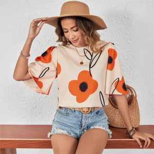 ヨーロッパとアメリカのアマゾンクロスボーダーフラワープリントトップス2025夏のファッション新しい女性の半袖シャツ