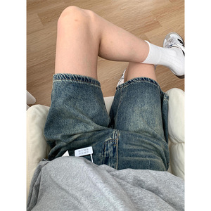 アメリカンレトロデニムショートパンツ女性用2025夏薄いハイウエストルーズスリムストレートワイドレッグ5点ミディアムパンツ