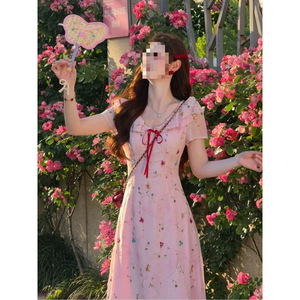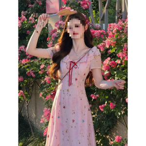 フレンチティーブレイクスタイル甘い耳長スカート気質花柄ウエストドレス2025新スタイル