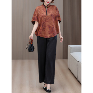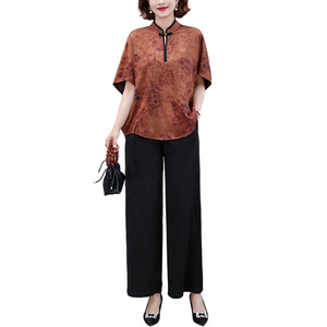 品質保証シルク快適な大きいサイズ年齢を減らす新しい夏の高貴なトップスとパンツ気質ママツーピーススーツ