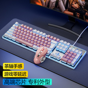 【キーボード&マウスセット】ピンクホワイトアイスブルーライト【茶軸感】+VP900有線静音マクロマウス+ハイエンドチップ+メタルパネル+クール照明効果2点セット